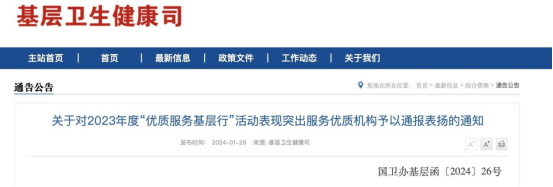 近日,国家卫生健康委、国家中医药局联合下发《关于对2023年度“优质服务基层行”活动表现突出服务优质的机构予以通报表扬的通知》。经过机构自评、县区级审核、省市级复核、国家专家组现场一致性评价等严格程序,最终确定2400余所社区卫生服务中心和乡镇卫生院达到服务能力推荐标准。高新区绿地社区卫生服务中心作为全市6家通过国家复核的社区卫生服务中心服务能力“推荐标准”其中之一上榜。