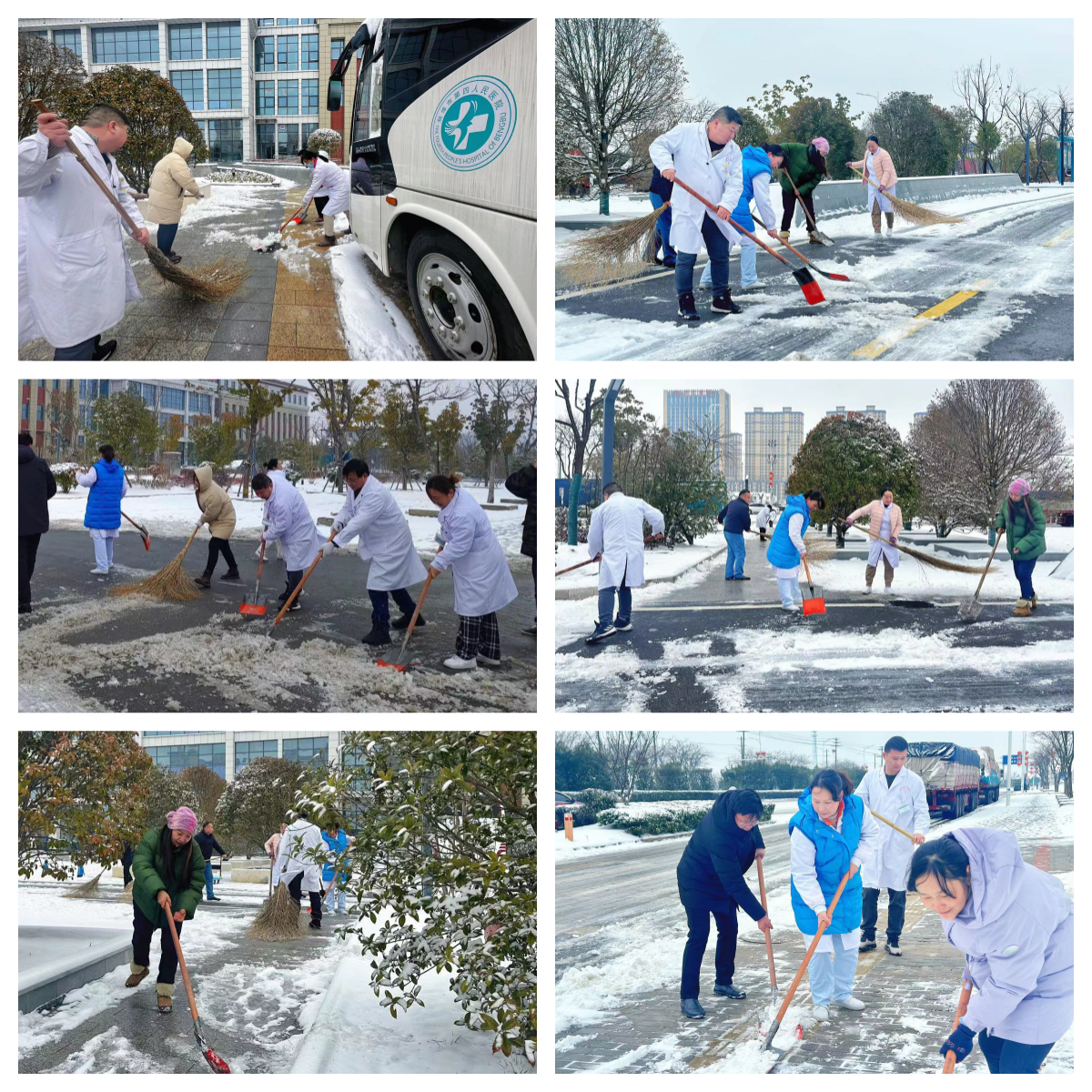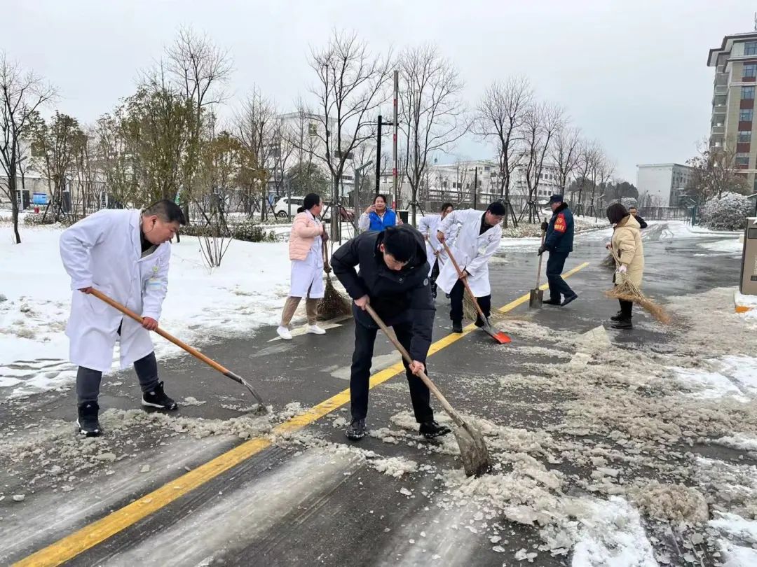大家手持除雪铲、扫把等清理积雪的工具,忙碌在医院各个角落,特别是患者到院就医的必经通道,大家不畏严寒进行扫雪除冰工作,有的铲、有的扫、有的推,大家齐心协力,配合默契,干得热火朝天,快速有序将主干道上的积雪清理干净,保障了医院内各条道路的畅通。