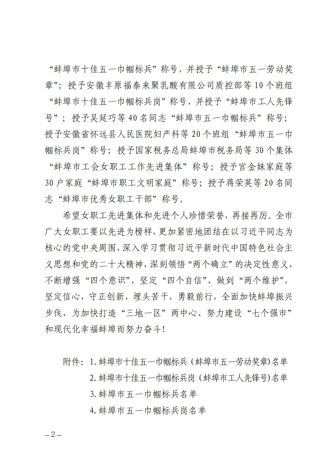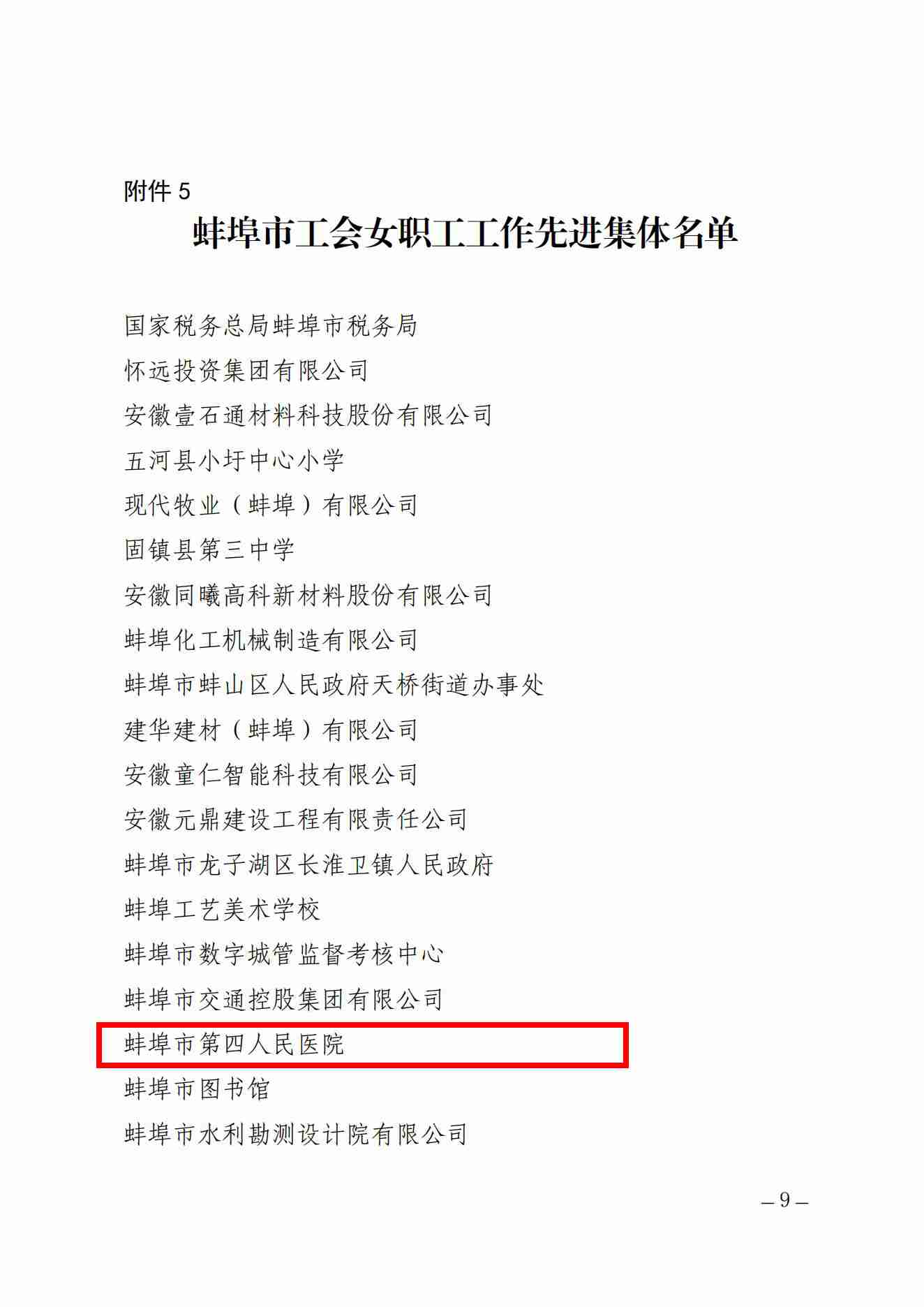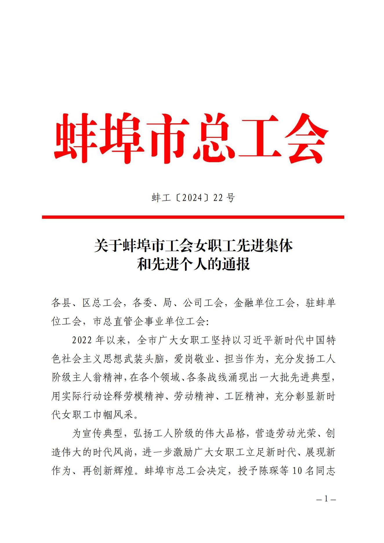 近日,蚌埠市总工会发布《关于蚌埠市工会女职工先进集体和先进个人的通报》,蚌埠市第四人民医院(市康复医院)被评选为蚌埠市工会女职工工作先进集体。
