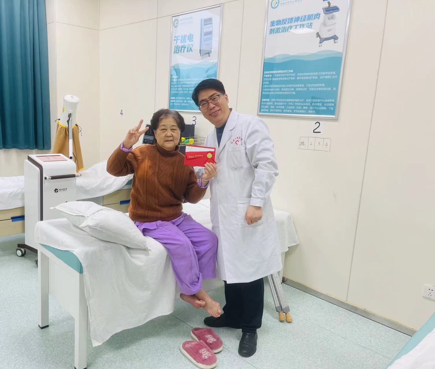 一句关切的问候,一次亲切的交流,就能为患者带来巨大的心理支持和力量。3月27日,正值沈阿姨生日之际,康复治疗部汪升均主任亲自手写了一张“祝福沈阿姨早日康复”的生日卡片在治疗时悄悄的送到了沈阿姨手上。沈阿姨是第四次在我院接受康复治疗,收到生日卡片的她表示非常开心。她说:“感谢您们的生日祝福!你们四院不仅医术精湛,服务也是一流的。院里每个人都待人亲切,真是太好了!”