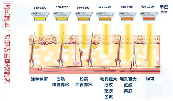 强脉冲光(IPL)具有嫩肤(通过刺激胶原生长,改善毛孔粗大等皮肤质地问题)、祛斑美白亮肤、去黄气、退红封闭毛细血管及脱毛等多种作用。