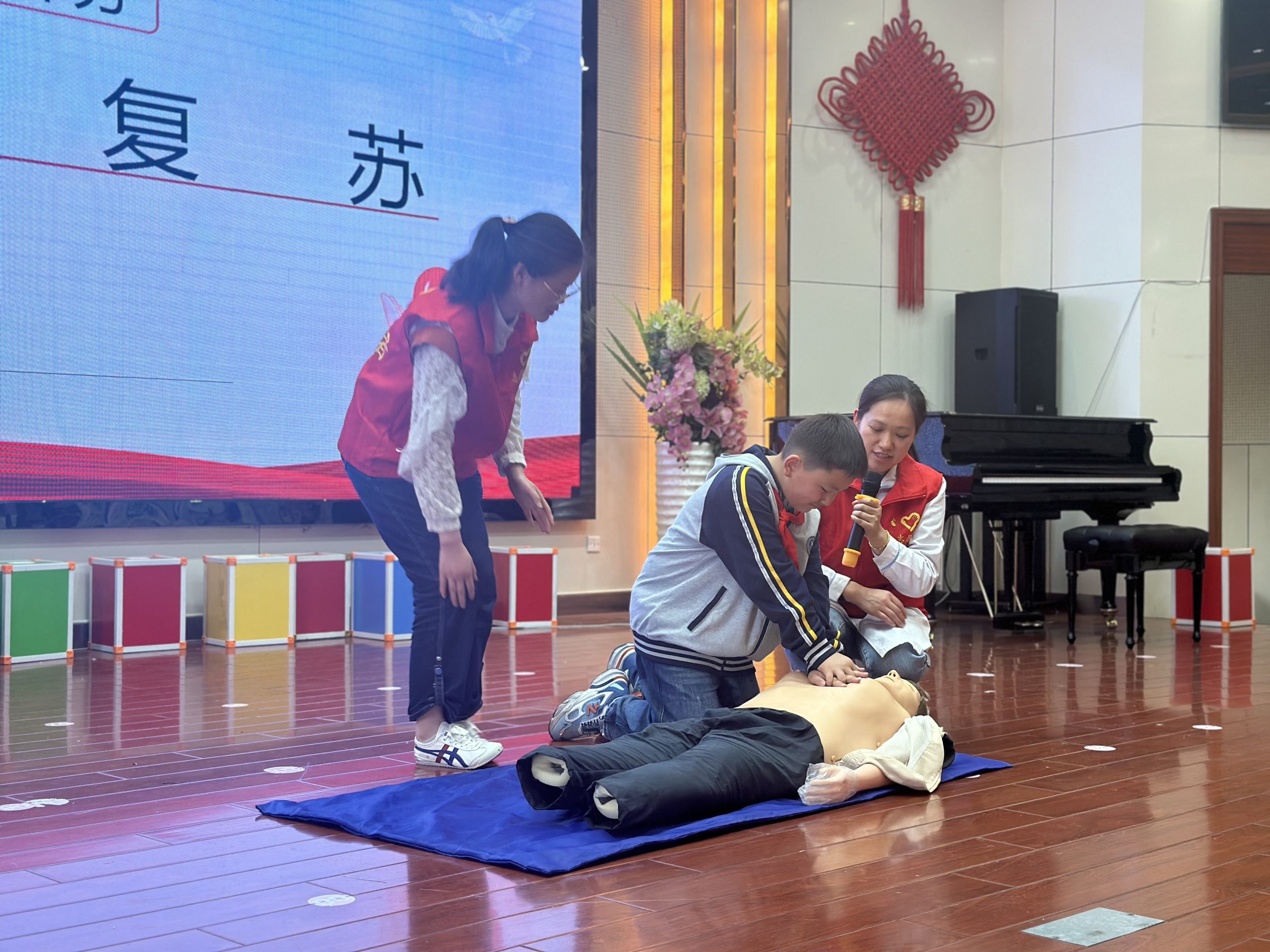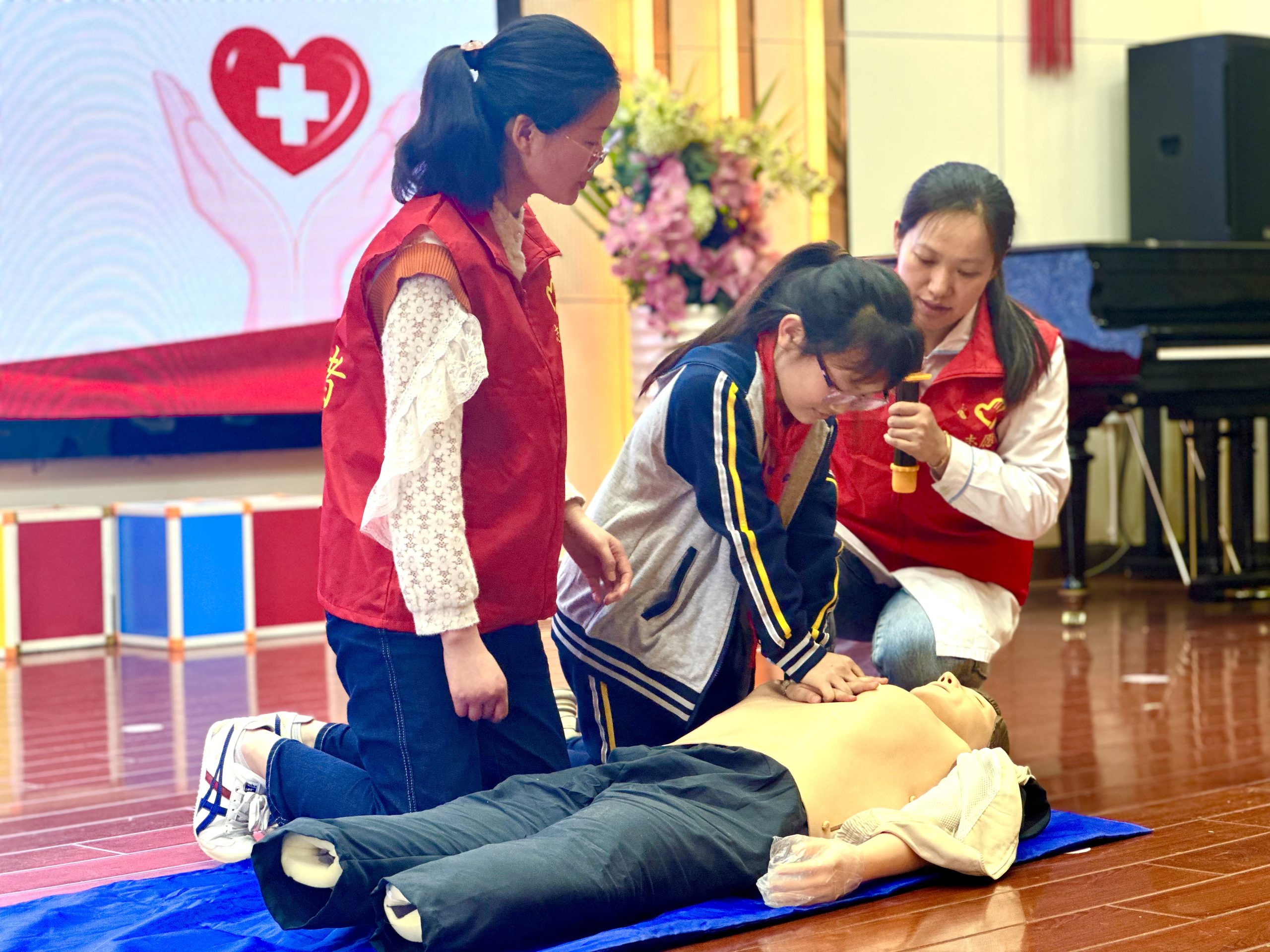 此次讲座精心设计,分为理论授课、模拟演示、实践练习和现场答疑四个环节。志愿者通过PPT展示、现场互动和实操演示等方式,深入浅出地讲解了徒手心肺复苏现场环境评估、急救原则及步骤的知识。活动重点强调了在心脏骤停等紧急情况下,如何在宝贵的“4—6分钟”黄金抢救时间内运用心肺复苏技术挽救生命。此外,还详细介绍了应对气道异物等突发事件的急救方法,包括如何正确使用海姆立克手法进行自救和互救。