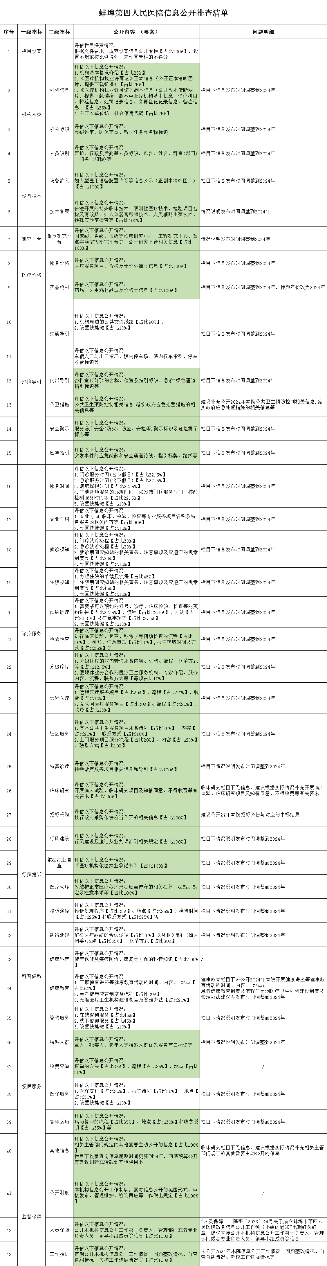 根据2024年4月蚌埠市政务公开办公室关于召开政务公开测评问题整改和相关业务培训会,我院针对10项40条信息公开内容进行重点整改并自查,主要涉及栏目更新时间设置、诊疗服务栏目、健康讲座信息、健康教育制度、自查整改等方面,截至2024年4月30已完成问题整改,下一步,我院将严格对照信息公开内容及形式标准要求,按季度组织开展自查自纠工作,做到举一反三,确保公开及时完整准确信息,方便群众在线查询,引导患者高效便捷就诊,切实提升医院工作效能,改善患者就医感受,提高群众幸福感。