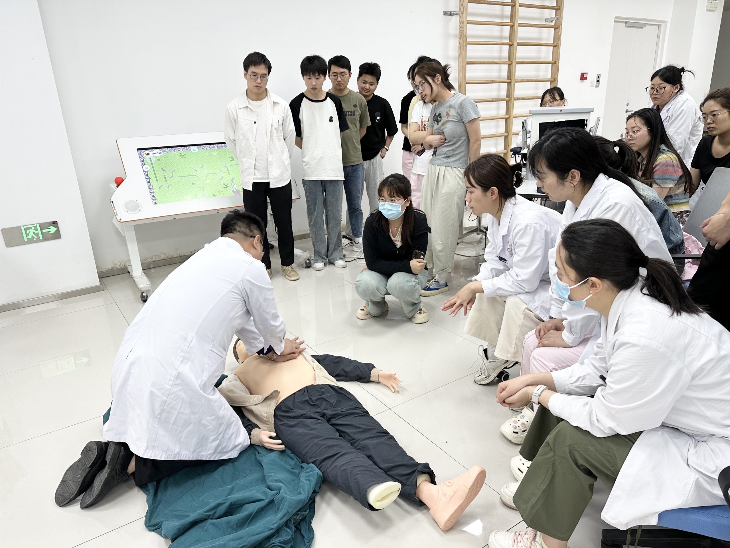 本次培训分为理论讲解和现场模拟两部分,培训内容包括:救护概论、现场心肺复苏术(CPR)、气道异物梗阻、自动体外除颤器(AED)的使用等多个方面。