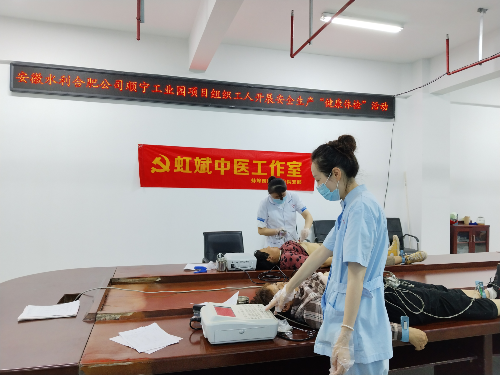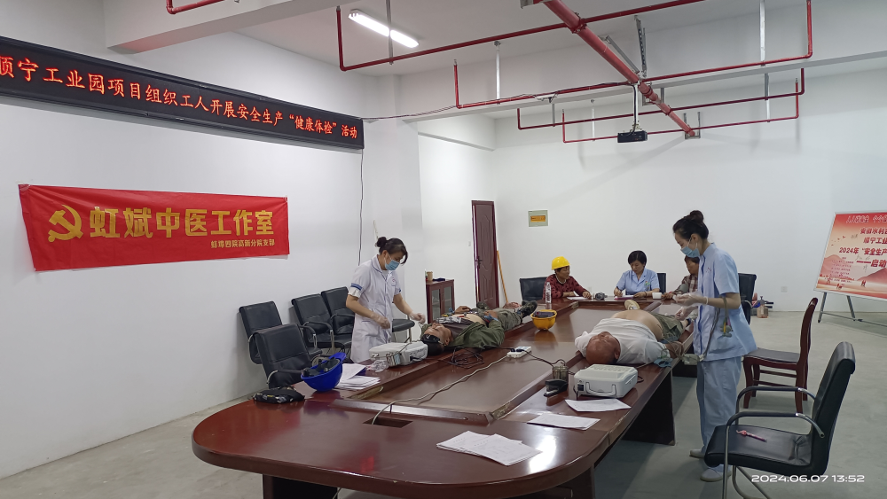 2024年6月7日,在蚌埠市第四人民医院(市康复医院)虹斌中医工作室携手体检中心的党员医护人员,深入安徽水利新安建设有限公司,为辛勤工作的一线员工上门“送健康”,确保一线工友健康上岗。