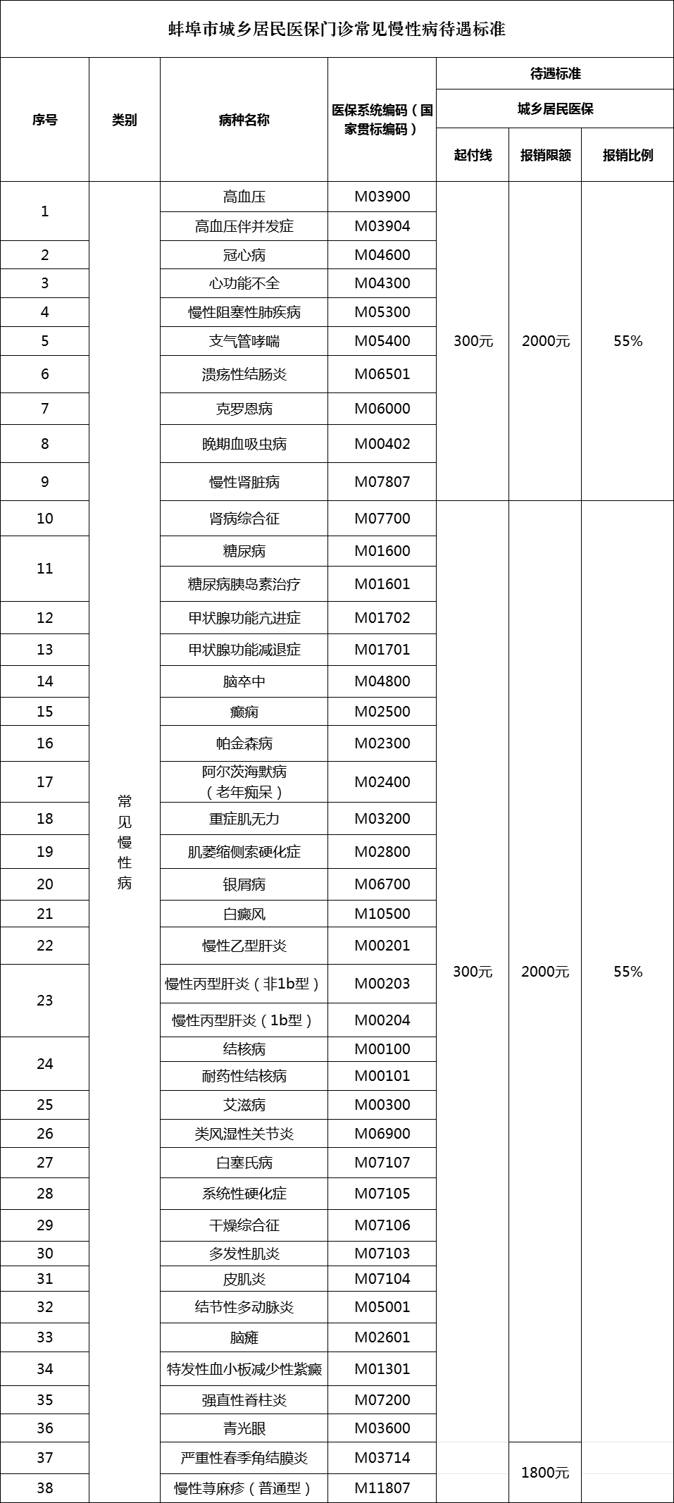 居民医保门诊慢性病患者经鉴定通过后,在我市一级及以上定点医疗机构(含社区卫生服务中心、乡镇卫生院)医疗机构就诊,享受常见慢性病待遇,年度起付线300元,可报销费用报销比例为55%。单一病种年度报销限额为2000元(个别报销限额1800元,详见下表),每增加一种慢性病病种提高800元,最高不超过3600元。具体报销比例如下: