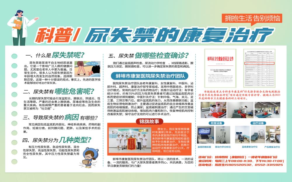 蚌埠市第四人民医院(市康复医院)尿失禁治疗团队,将以一流的技术、一流的设备、一流的服务,与广大尿失禁患者携手同心、共抗病患,为您的早日康复贡献我们的力量!