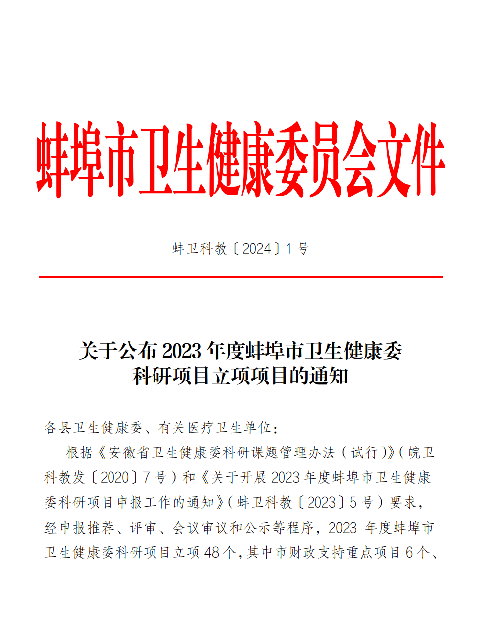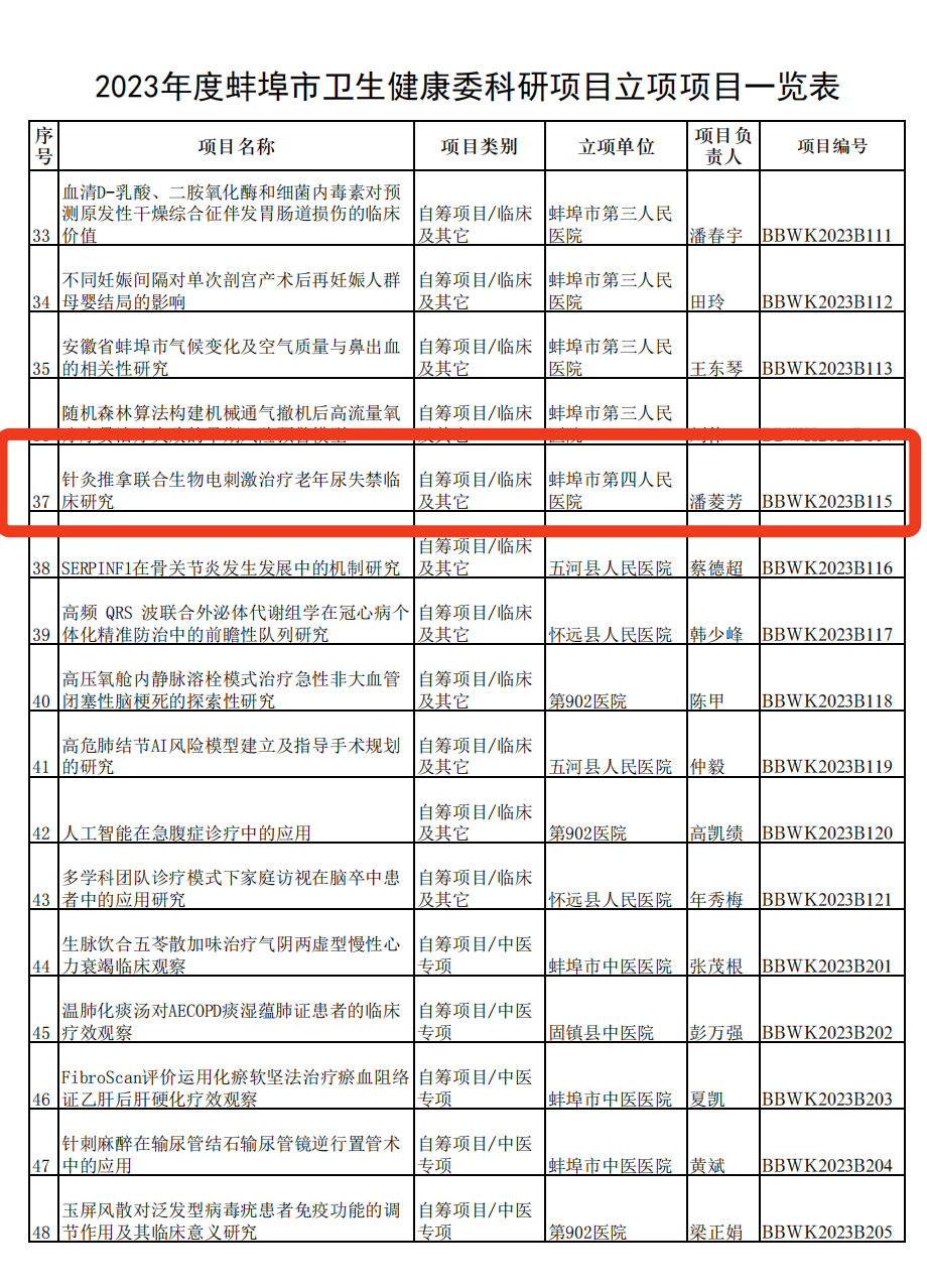 市级临床重点专科老年康复科“针灸推拿联合生物电刺激治疗老年尿失禁临床研究”项目通过市级专家评审,被确立为2023年度蚌埠市卫生健康委科研立项项目。