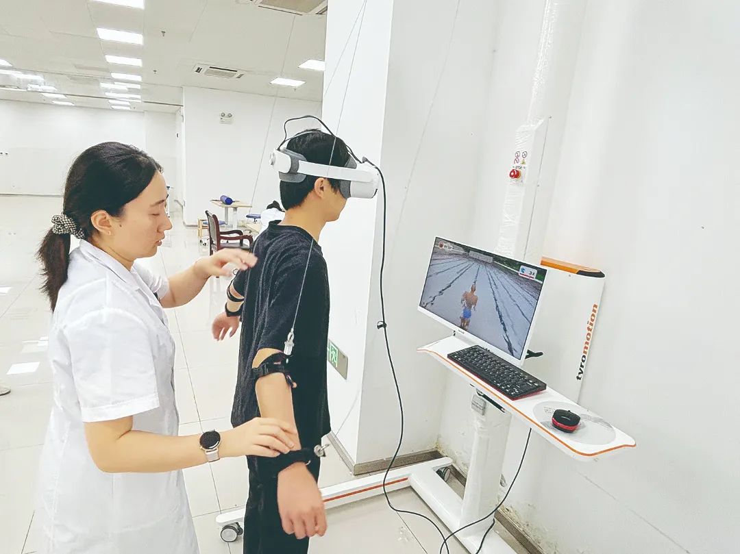 ▲医护人员使用VR技术帮助患者进行康复治疗。