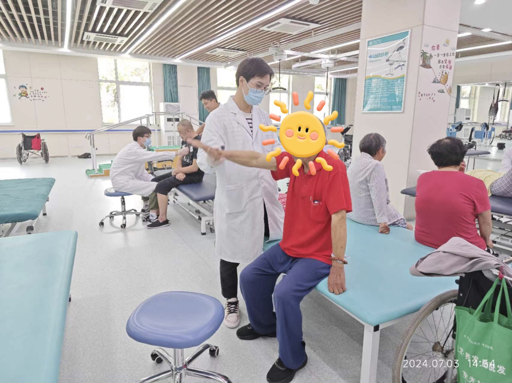 经过我院康复评定科首次从肢体评定、肺功能评定、平衡功能评定等全方位评定后,发现陈大爷患侧肢体肌力只能达到3级,不能独站,患侧肢体轻触觉感觉减退,运动觉和位置觉也出现障碍,并且患侧肩关节还有疼痛,从而造成日常生活能力大大下降。随后,由医师、治疗师、评定师召开康复评估会,共同制定了专属陈大爷的康复治疗方案。