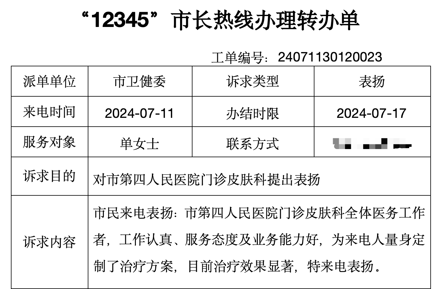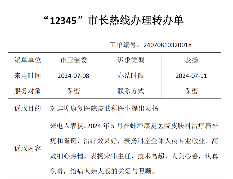 近一个月来,蚌埠市第四人民医院(市康复医院)皮肤美容科接收到的“12345”政务服务便民热线的表扬工单数量连创新高。