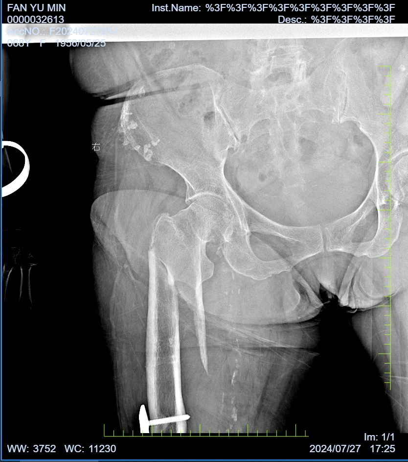 术后恢复期间,患者床旁摄片复查显示,右侧股骨髓内钉复位及内固定位置保持良好。范奶奶及其家属对手术结果表示高度满意,对我院的医疗技术和护理服务给予了充分的肯定。
