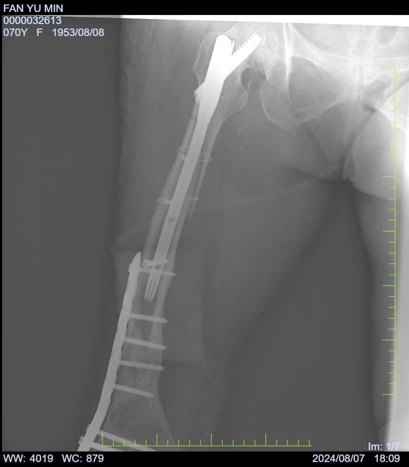 2024年8月3日,由骨科李贵主任主刀,在骨科团队的辅助下,顺利为范奶奶实施了精准的右侧股骨切开内固定装置去除术(针对部分螺钉)及股骨髓内钉内固定术。手术过程中,骨科与手术室(麻醉科)医护人员紧密协作,手术圆满成功。范奶奶术后状况稳定,且经C臂机透视确认右侧股骨髓内钉复位及内固定位置均理想,最终平安返回病房。