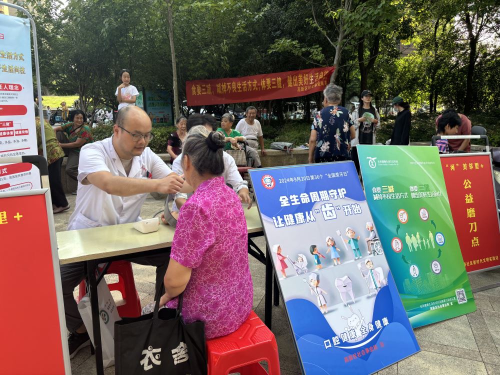 义诊现场,来自中医科、公卫科、全科、内科、口腔科等多个科室的医生,耐心地为每一位前来咨询的社区居民进行身体检查和解疑答惑,并结合自身经验向群众传授健康养生,健康运动技巧、技能,健康文明等相关知识。