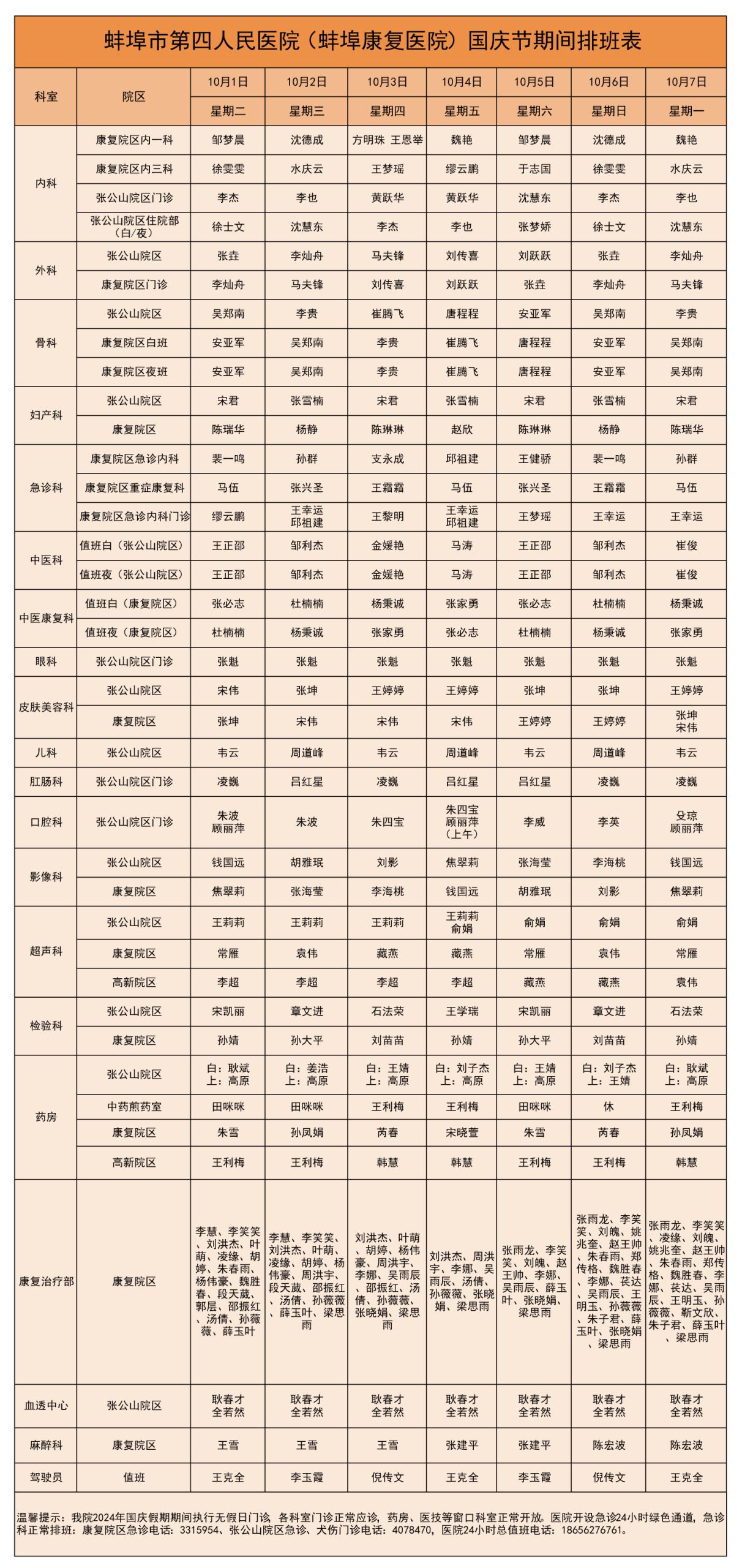 蚌埠市第四人民医院2024年国庆假期期间(10月1日﹣10月7日)执行无假日门诊,各科室门诊、专家门诊正常应诊,药房、医技等窗口科室正常开放。医院开设急诊24小时绿色通道,急诊科正常排班。