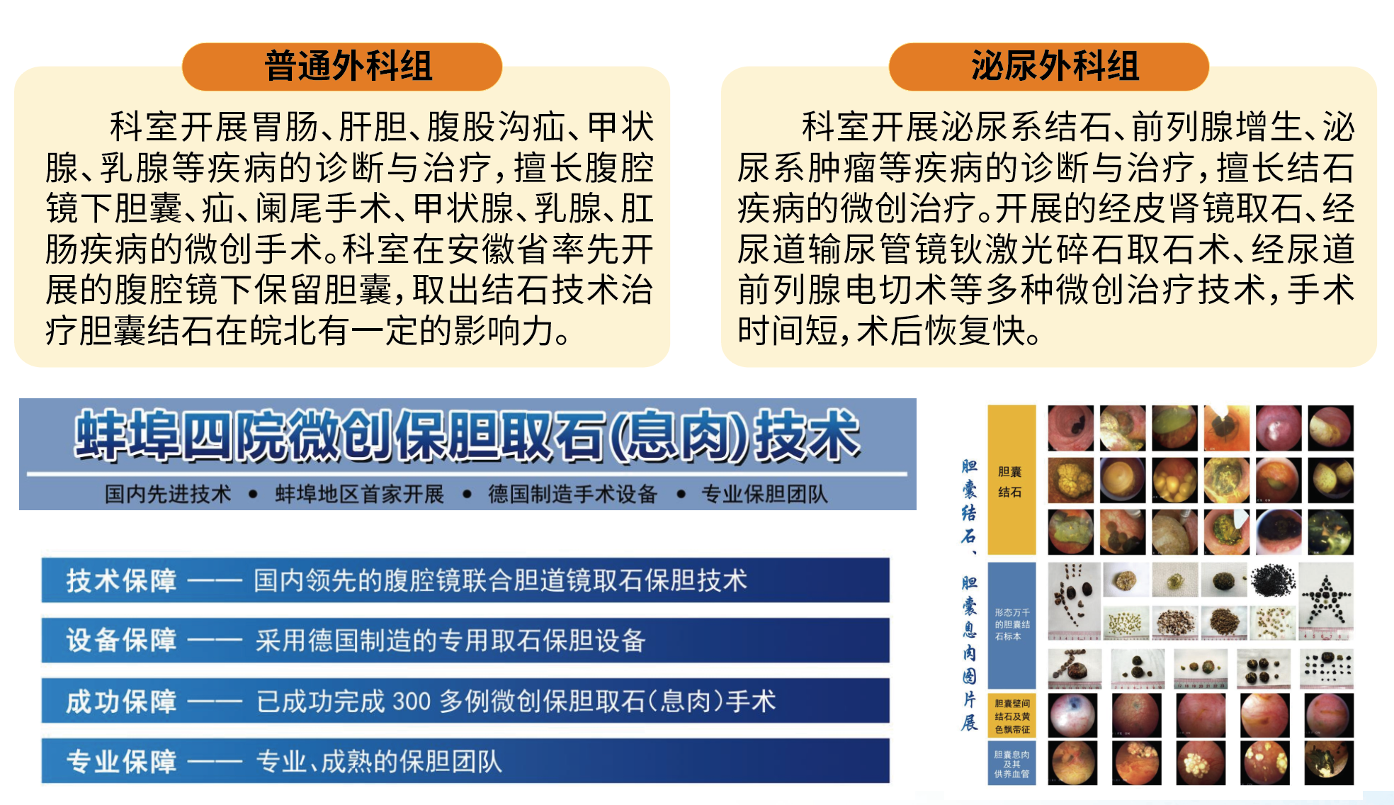 蚌埠市第四人民外科是以微创手术、结石病治疗为特色的科室,分为普通外科、泌尿外科二个专业治疗组。下设急诊外科门诊、外科门诊、急诊手术室,病区位于住院部四楼,开放床位36张。专家团队从事结石病微创治疗20多年,在胆道结石,泌尿结石治疗方面经验丰富,治疗效果显著。