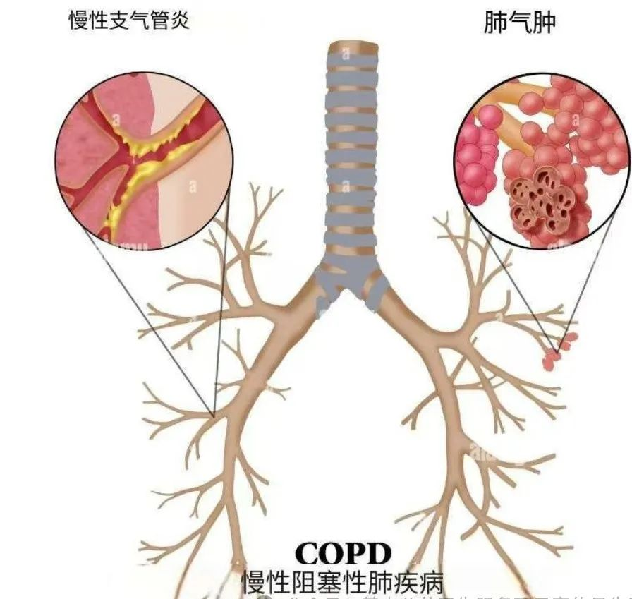 慢性阻塞性肺疾病(COPD)是一种慢性呼吸道疾病,主要由气道异常(支气管炎、细支气管炎)和(或)肺泡异常(肺气肿)导致的持续性、进行性气流阻塞所引起的慢性呼吸道症状(呼吸困难、咳嗽、咳痰)。