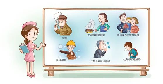 ▷ 长期吸烟或吸二手烟:烟中的有害物质长期刺激气道管壁,抑制支气管黏膜纤毛的活动,影响肺泡作用。