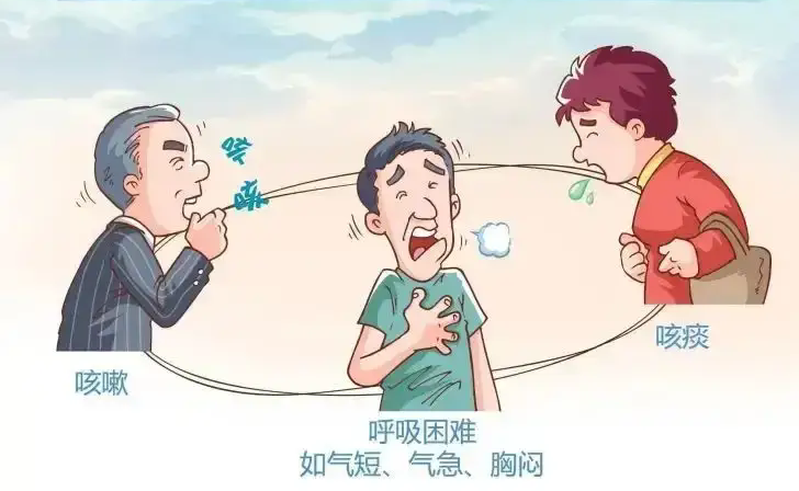 ▷ 呼吸困难:慢阻肺最重要的症状,早期仅在体力劳动时出现,后期逐渐加重,日常活动甚至休息时也会感到气短。