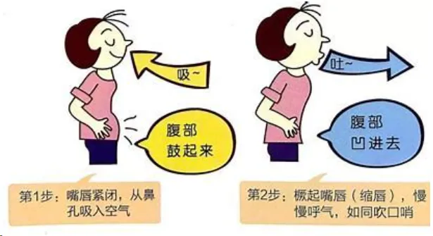 吸气时用鼻子,呼气时嘴像吹口哨一样慢慢呼气的方法。这样可以让气道的压力高,防止气道的陷闭,调解呼吸频率。吸气和呼气的比例从1:2变换成1:4。