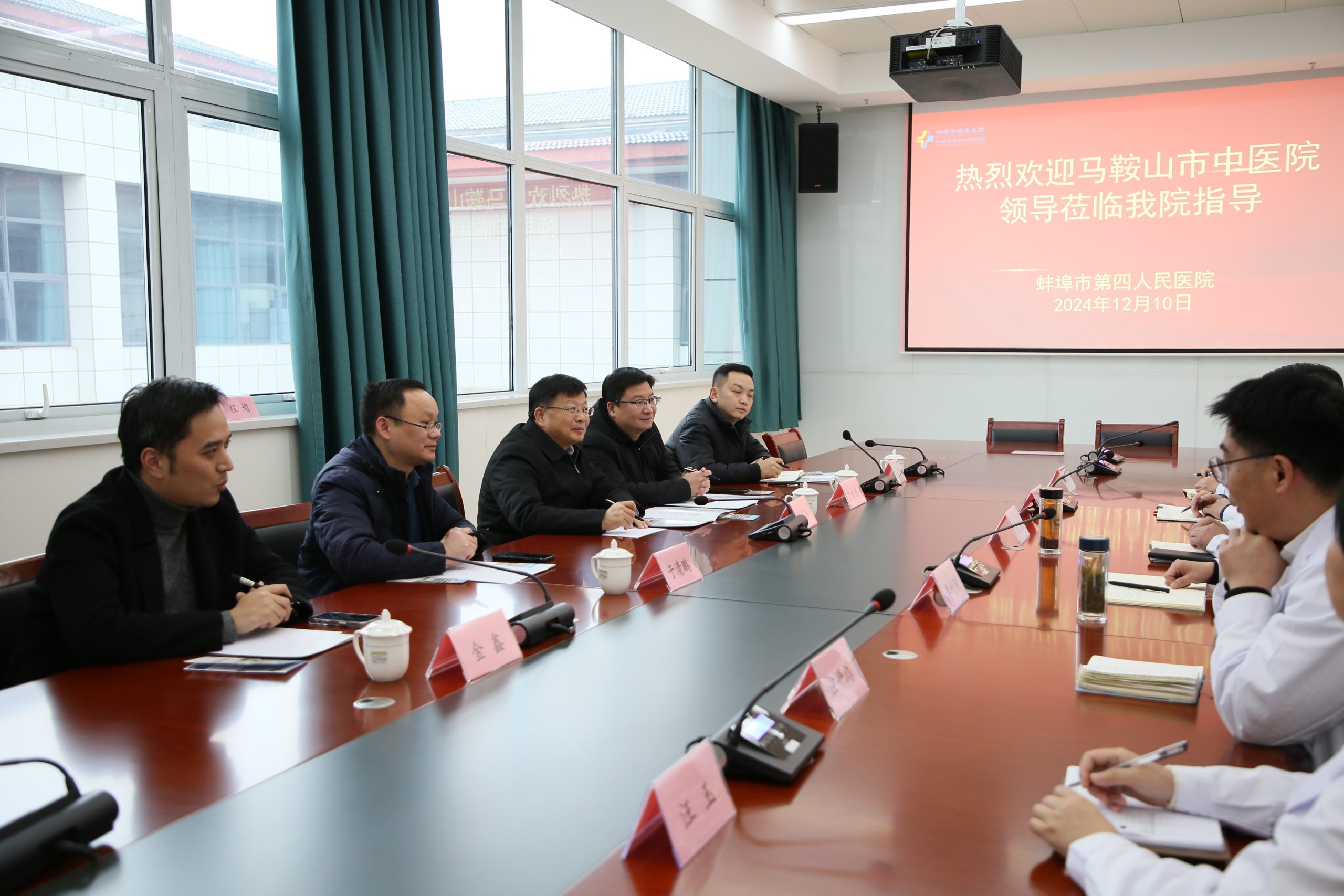 2024年12月11日,马鞍山市中医院党委副书记、院长魏有刚一行莅临蚌埠市第四人民医院(市康复医院),就医院管理、康复医学、学科建设及医养结合等议题开启深度座谈交流,旨在携手共促区域医疗事业高质量前行,为患者提供更优质服务。我院党总支副书记、院长施彪及相关领导热情接待。